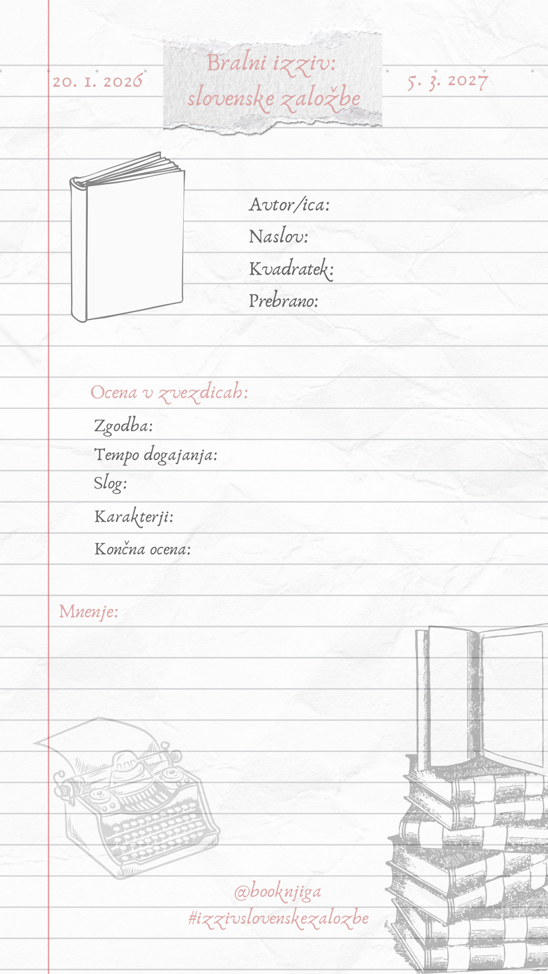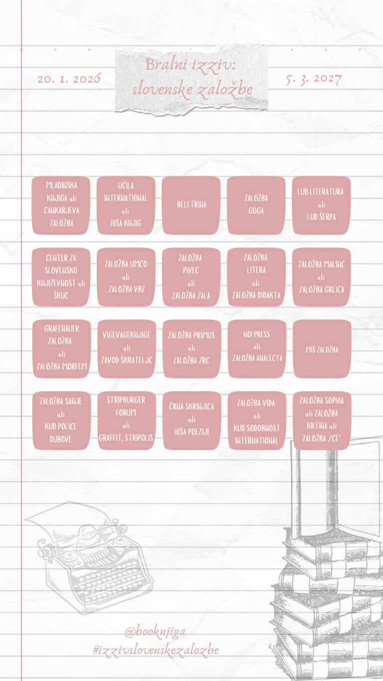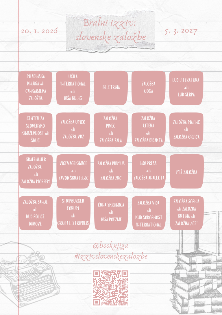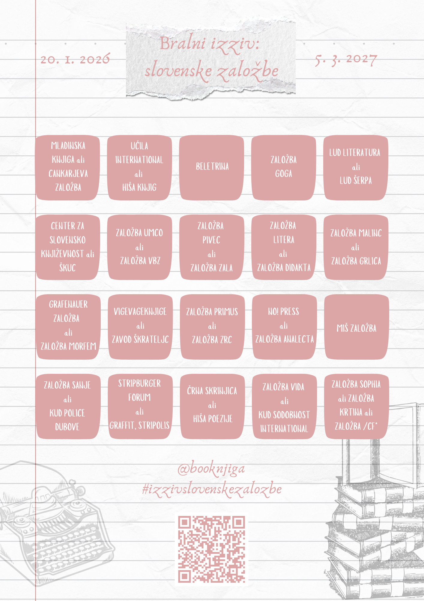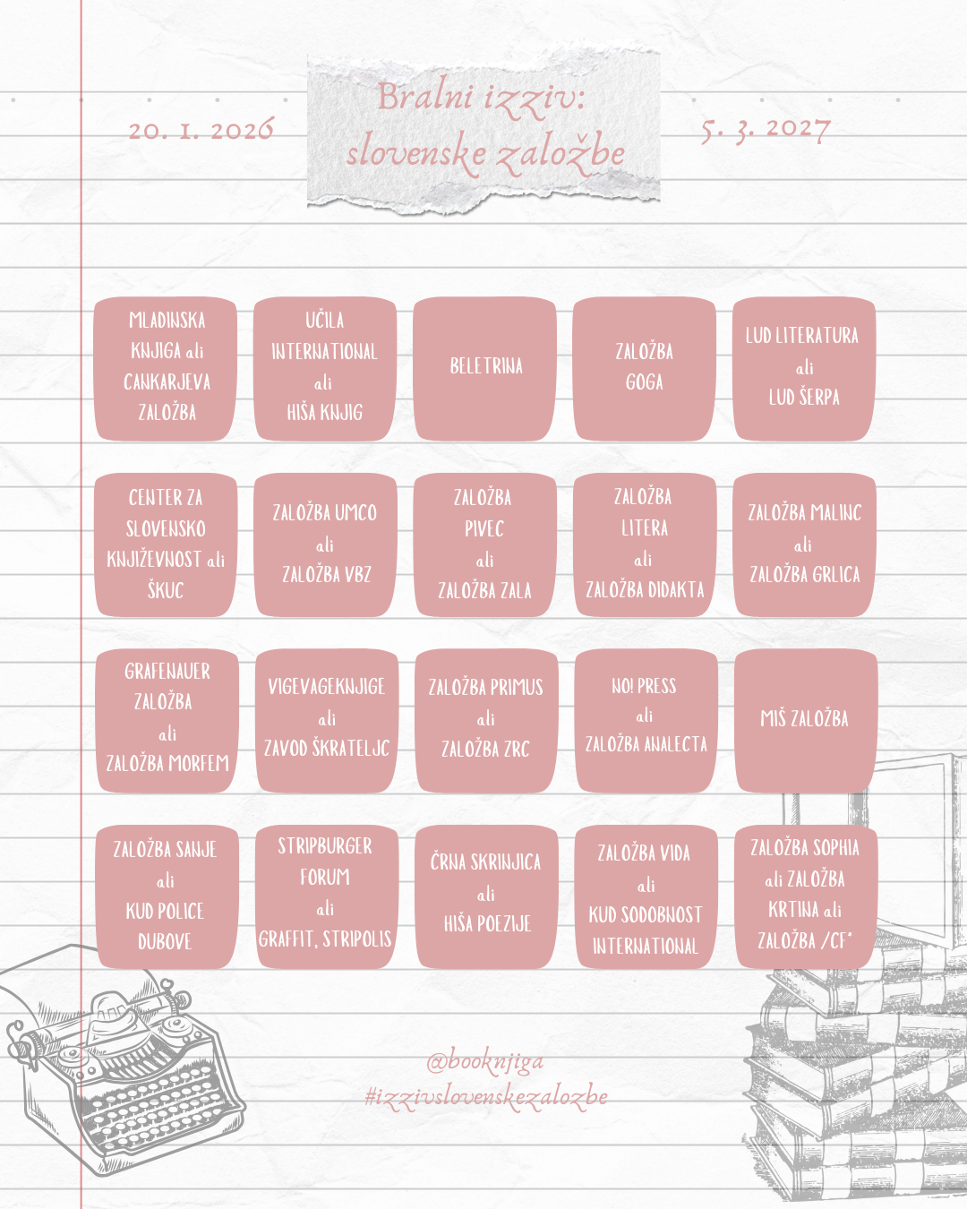 Nov bralni izzvi je za razliko od prejšnjega (Izzivalni klasiki – ki se ga sami še vedno lahko udeležite) malce lažje, hkrati pa osredotočen tudi na promocijo slovenskih založb in njihovih knjig. V letu 2026 bomo tako za izziv brali njihove knjige, v načrtu so tudi različne promocijske aktivnosti in pogovori za rubriko na blogu, kjer bodo posamezne založbe tudi podrobneje predstavljene s pomočjo pogovorov z akterji v založbah.